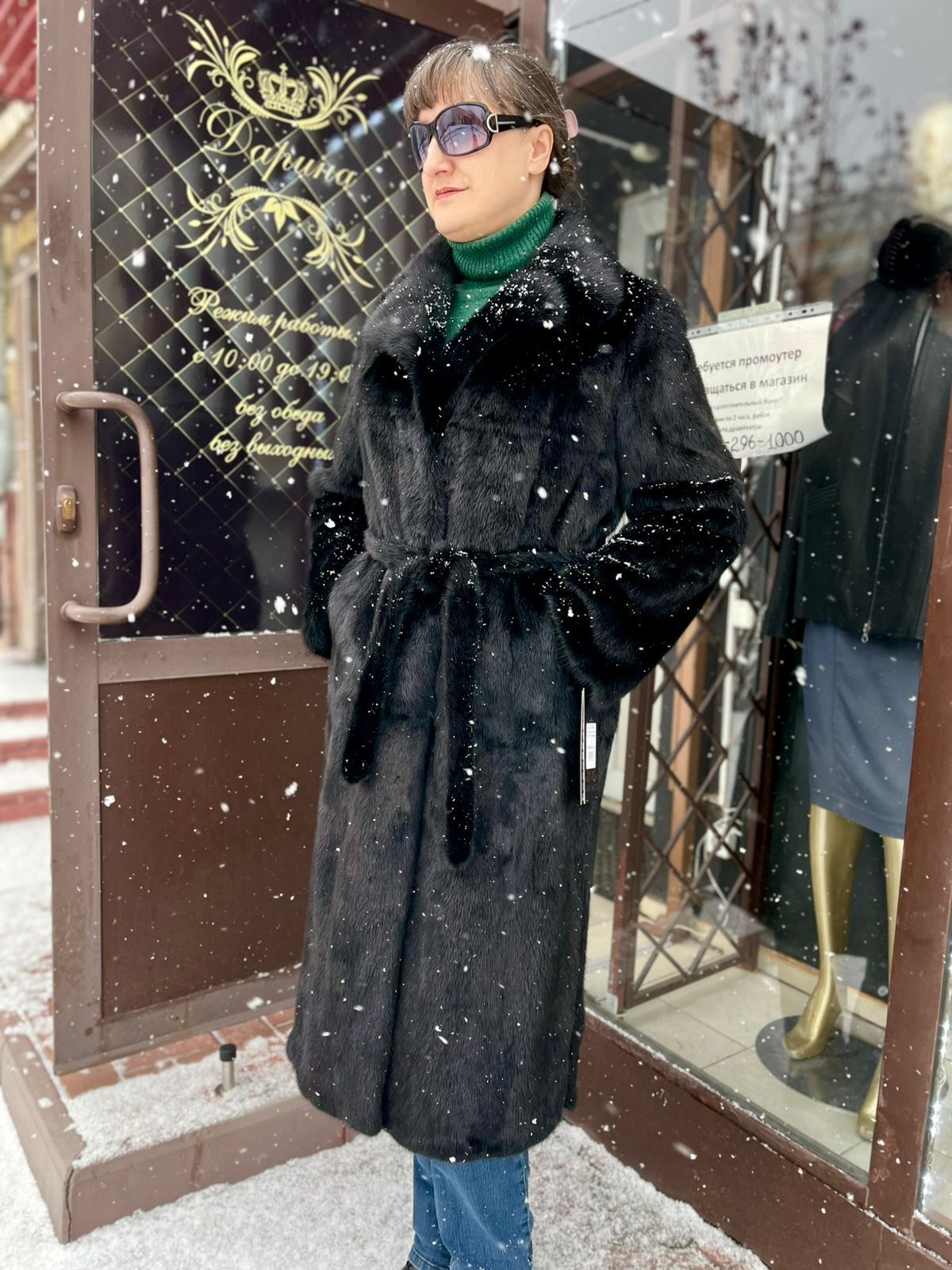 Пальто женское из меха норки, модель халатик с английским воротником в цвете "чёрный бриллиант", длина 120см