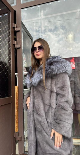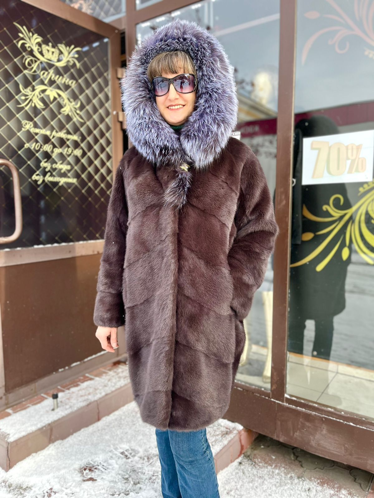 Меховое пальто из меха норки с капюшоном с отделкой из меха соболя.