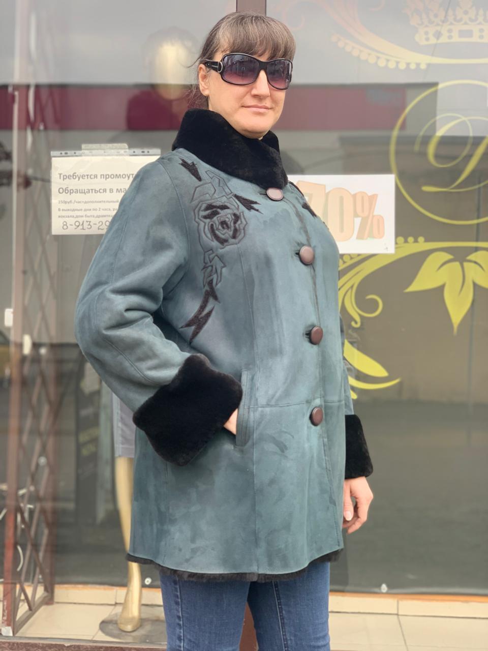 Дублёнка женская с воротом стойка и декоративной вышивкой, цвет морская волна, натуральная овчина