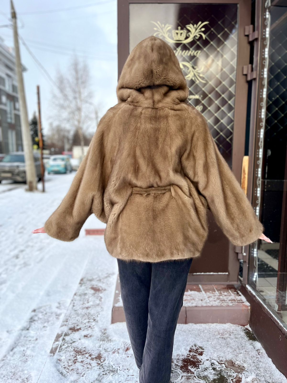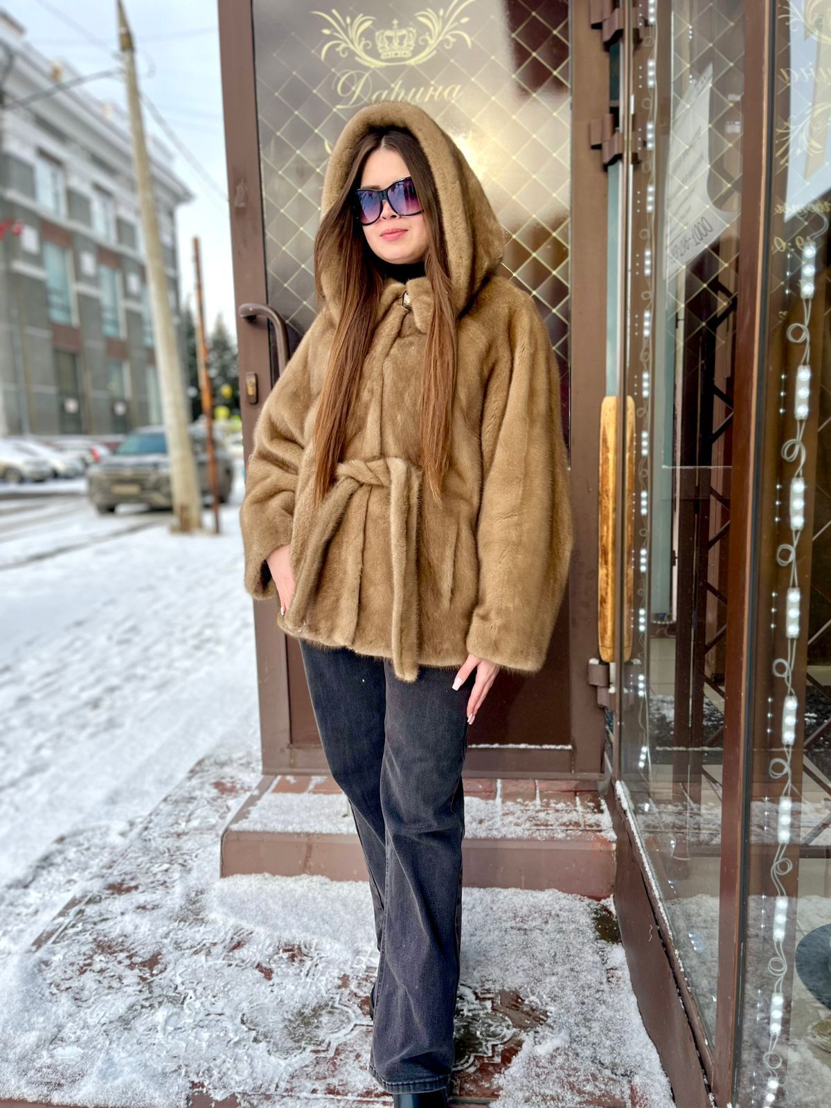Куртка женская из меха норки с капюшоном в цвете орех, рукав летучая мышьрукав