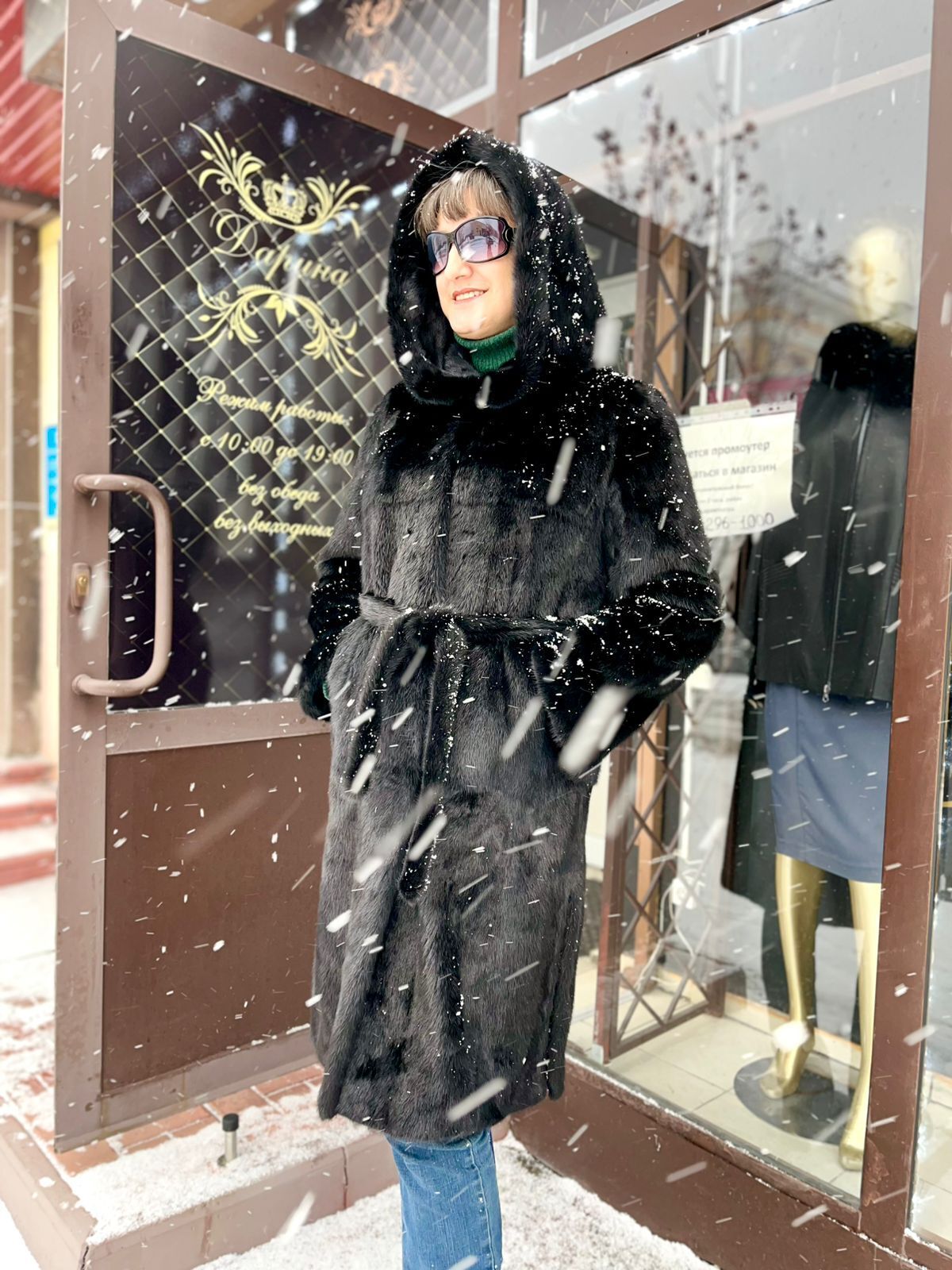 Пальто женское из меха норки, модель халатик с капюшоном в цвете "Чёрный бриллиант", длина 110 см