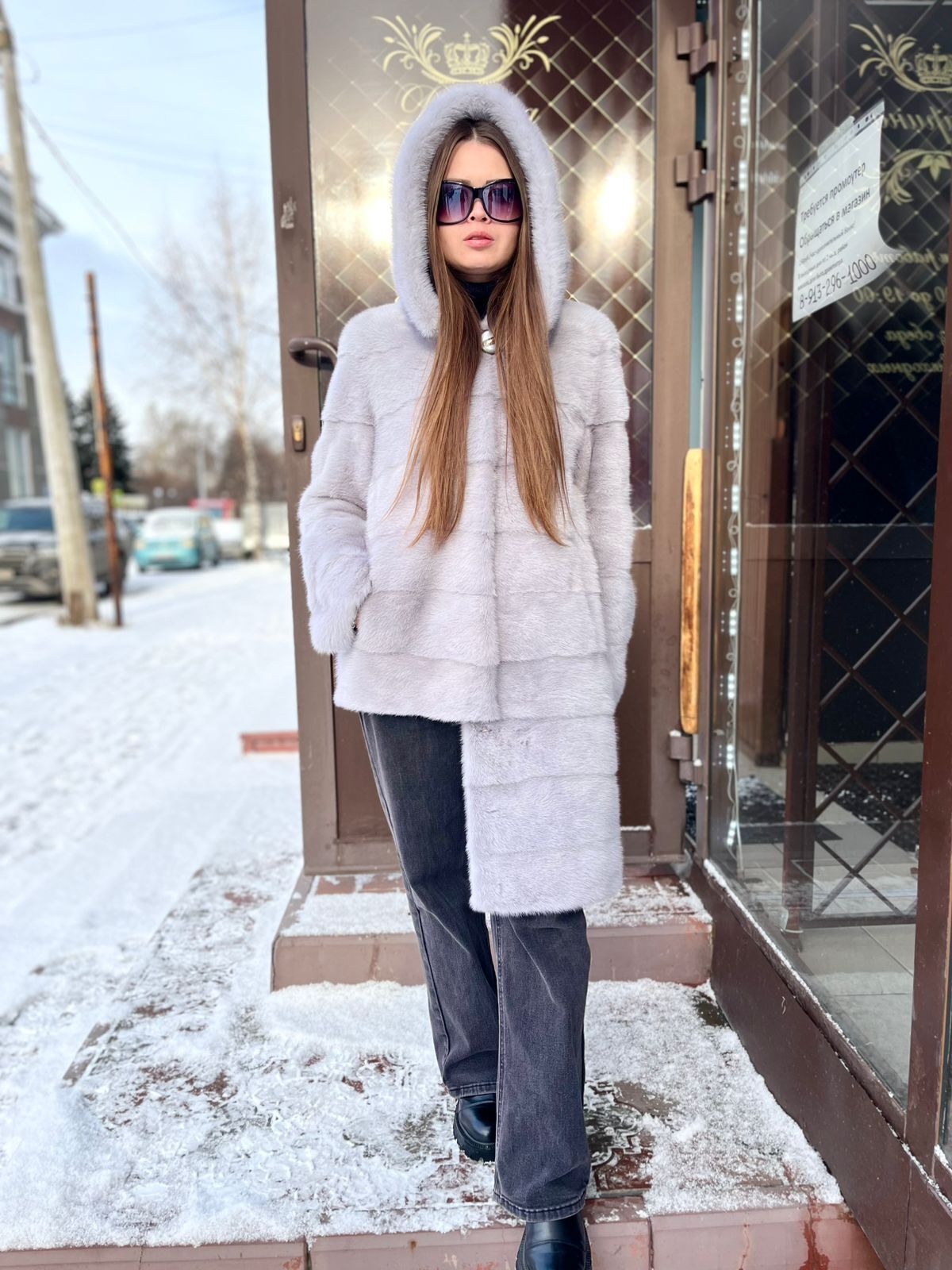Полупальто из меха норки с капюшоном в цвете графит модель халат с поясом по бокам разрезы
