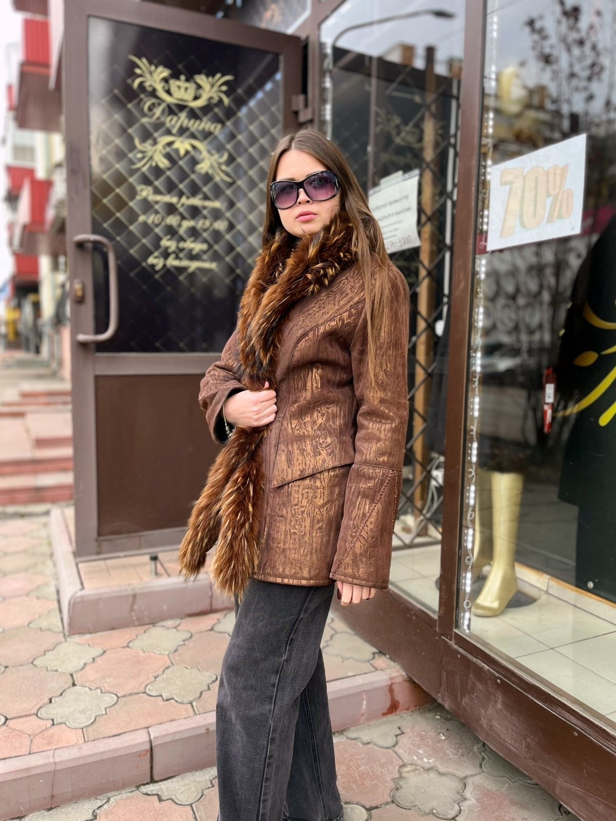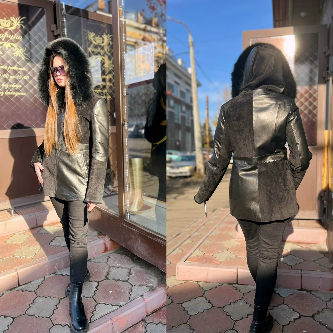 Кожаный пуховик, капюшон выполнен из меха лисы