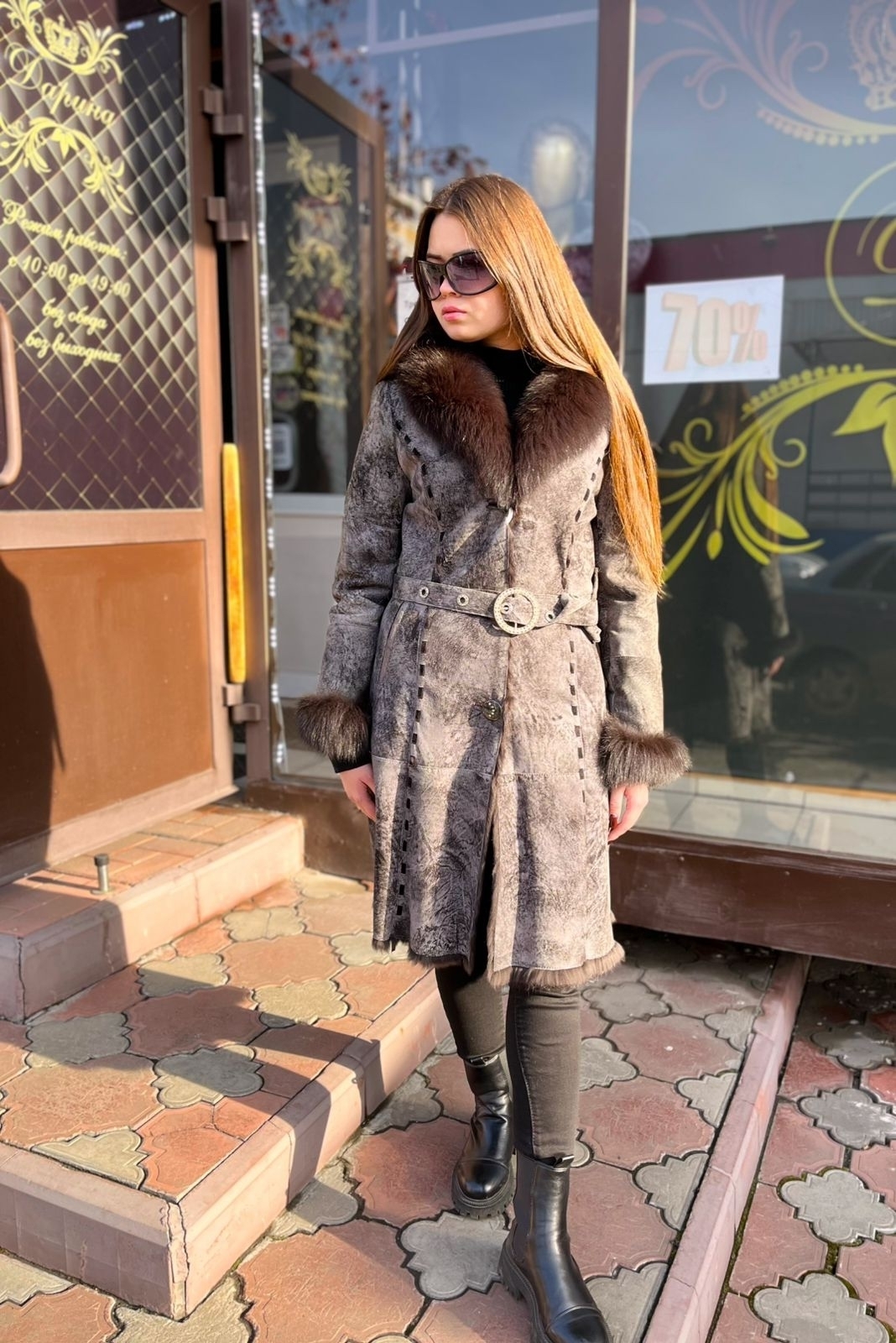 Дублёнка женская из кролика, отделка мехом песца, 95см