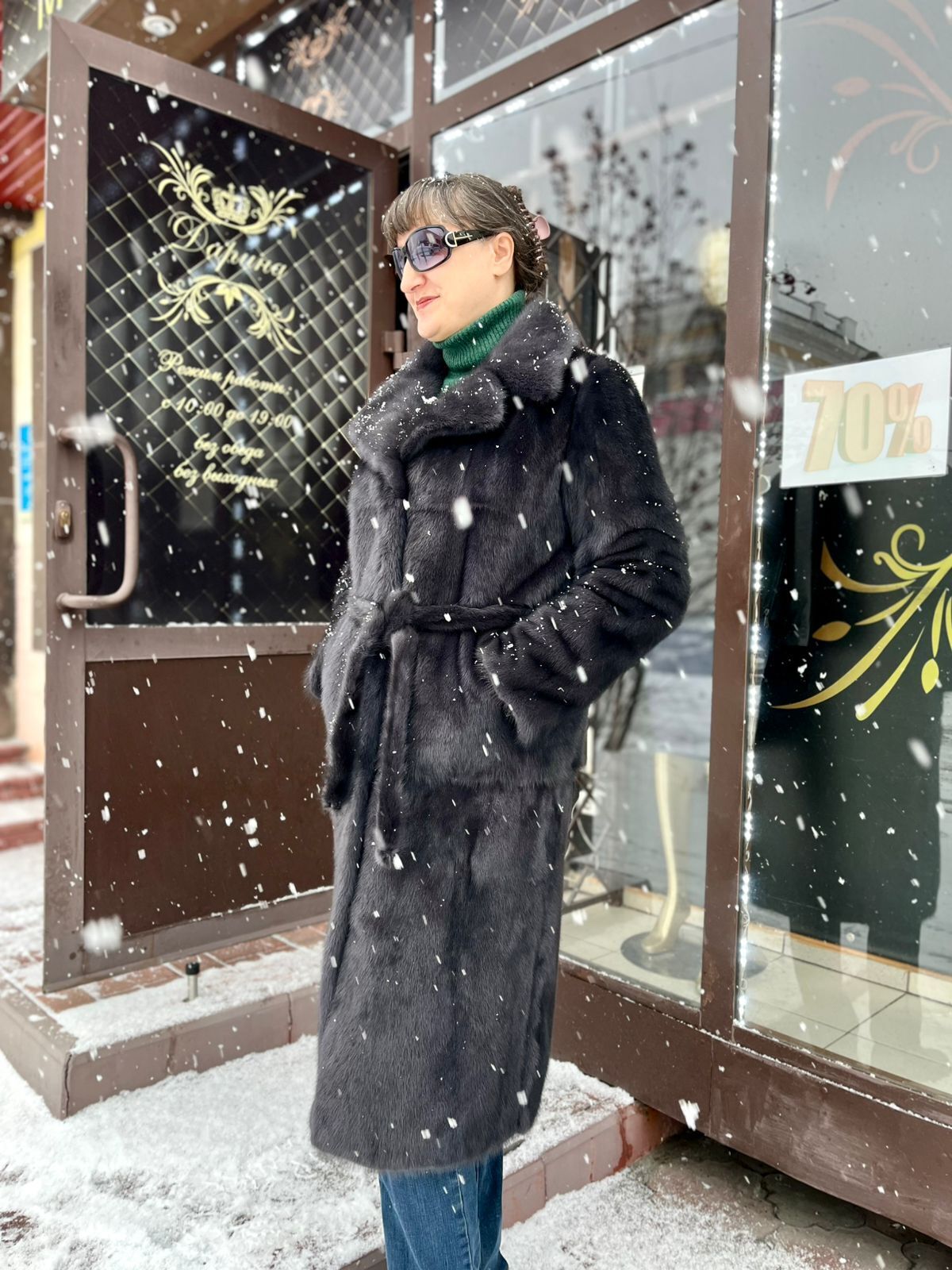 Пальто женское из меха норки, модель халатик с английским воротником в цвете графит, длина 120 см