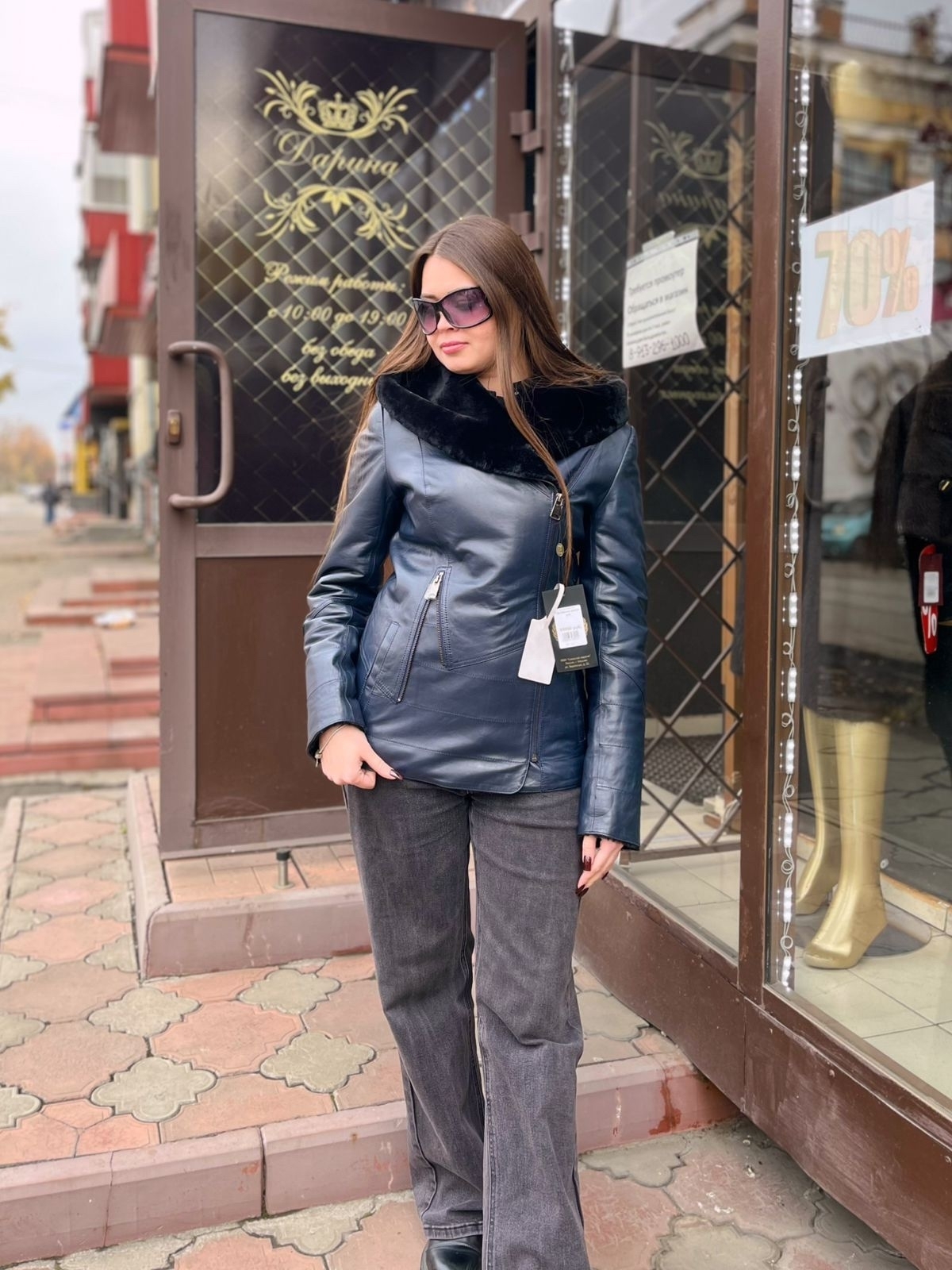 Натуральная кожаная куртка, в цвете чёрный бриллиант, английский ворот из меха песца